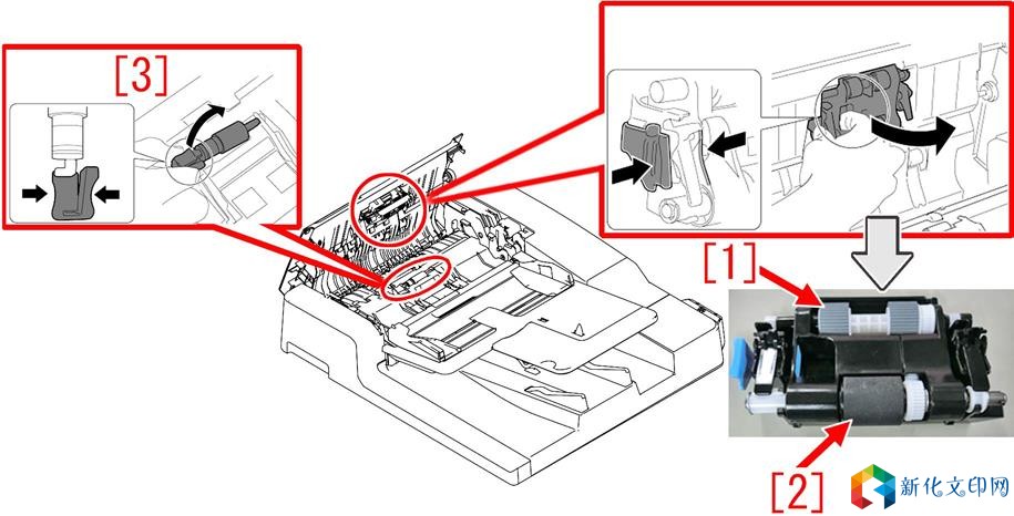 iR C3020 iR-ADV C3330 iR-ADV C3325 iR-ADV C3320 iR-ADV C3530 iR-ADV C3525 iR-ADV C3520 DADF-AV1 DADF-AQ1 [故障现象] 在使用自动输稿器进行纸张输送过程中可能会出现下列的卡纸情况: - 0003:拱起传感器(SR1)延迟卡纸 - 0043:拱起传感器(SR1)延迟卡纸 - 0009:前端传感器(SR2)延迟卡纸 - 0049:前端传感器(SR2)延迟卡纸 [参考] 0043 卡纸的发生可能性低。 [故障原因] 粘附在自动输稿器内的各类输送辊表面的金属或木质的粗质颗粒可能会导致纸张输送的性能有所降低。 [维修措施] 当出现上述故障时,准备DR-202 ADF 维护套件(4Y8-3044-020);同时更换自动输稿器内的拾取辊[1]、输送辊[2]和分离辊[3]。 [DR-202 ADF 维护套件中包含的零件] - 自动输稿器纸张拾取组件(FM1-D470-010) - 分离辊组件(FM1-D471-010) [参考] - 自动输稿器纸张拾取组件中包含了拾取辊[1]和输送辊[2]。 - 分离辊与分离辊轴为一体化组件结构,不再提供单独的零件(由于分离辊轴的表面加工过程的变化,此后被修改为新类型的分离辊组件)