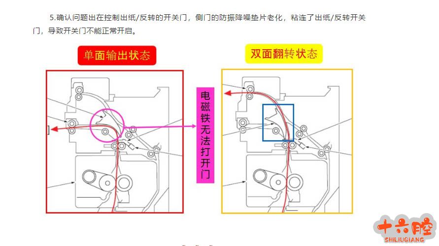 柯美Bizhub C364e 双面变单面输出并卡纸 <机型> bizhub C364e系列 <故障现象> 每天早上开机,复印打印单面正常;但打印双面时,机器第一张纸打印完第一面,就完全输出到接纸盘,然后提示卡纸(卡纸代码:32-01) ;重新开关侧门后,双面输出又恢复正常。