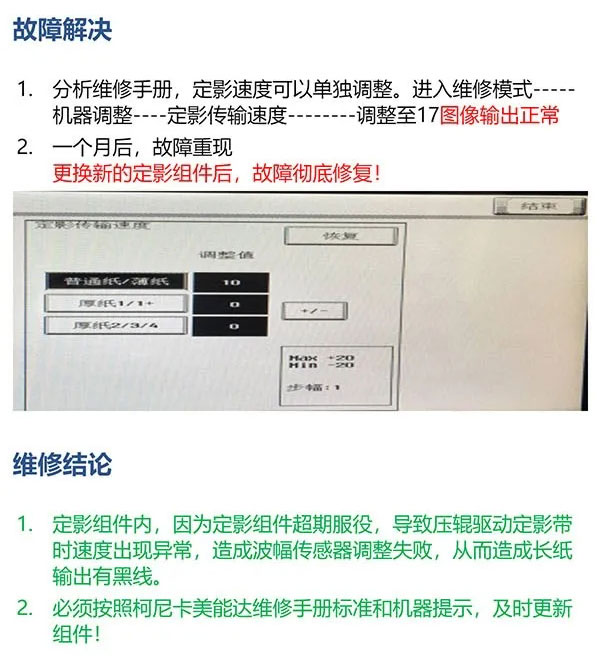 问题描述:– 用户的NS MFP1005/NS 1020使用一段时间后,连续打印的时候,会出现打印内容间歇性上移的问题,如下图所示问题原因:– 使用一段时间后,...