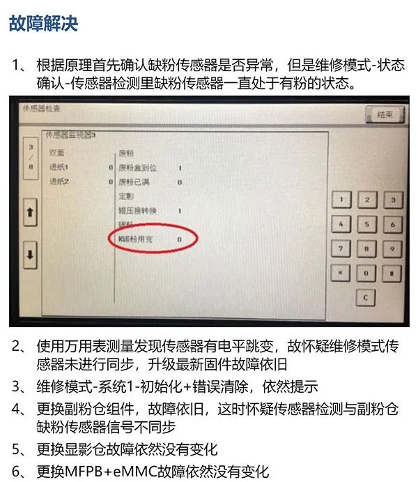 7、相关电气原件都已进行更换并测量线束正常,怀疑数据异常造成,进入维修模式状态确认-内存/HDD调整-格式化,对eMMC进很勿理格式化后故障排除 总结 此故障有—点小波折即传感器检测时,无法正常0&1 跳变,升级固件及更换组件仍然无变化,这时大家应使用万用表测量是否有电平变化,以此判定传感器能正常输出,后检测所有相关组件及连线后仍然有故障,建议使用格式化清除eMMC里异常数据尝试。 |