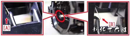 b-8) 更换墨粉盒传感器架1 区分新旧型号:新型支架的弹簧座[B]比旧支架长[A]。