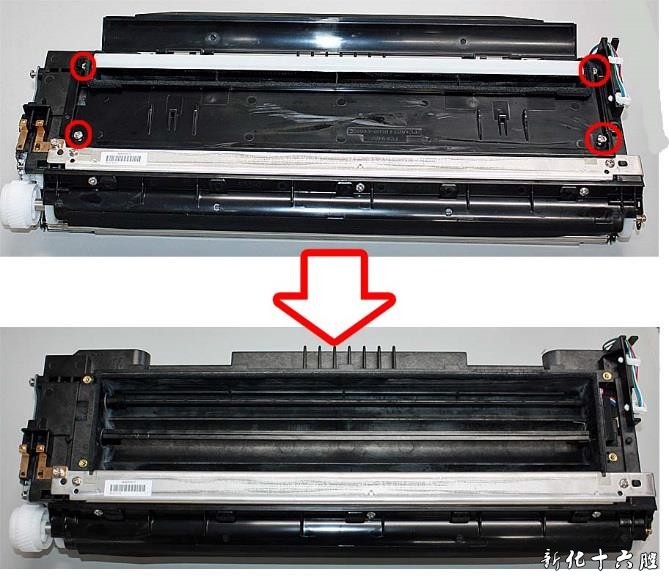3.准备并更换新型号的搅拌杆(FL3-2163-010)零件。 1) 参考维修手册拆下显影器组件。 2) 拆下4 颗螺丝,并取下盖子,下图所示。
