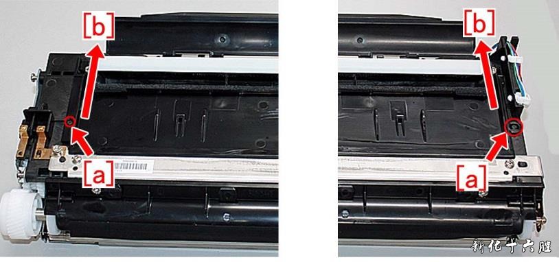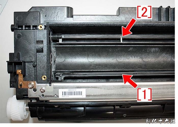 3) 使用真空吸尘器清除显影组件中剩余的墨粉。 4) 取下3 颗螺丝,然后从凸台上取下滚轮偏置板[1][a],从显影组件侧面取下金属板[2]。
