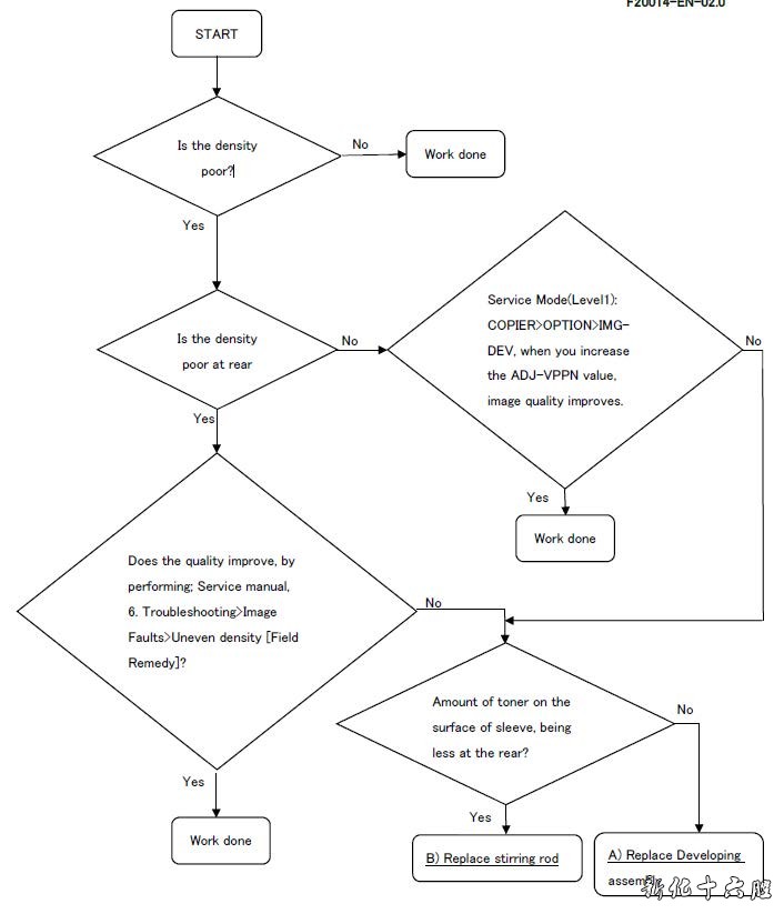 维修工作 当发生以上故障时,参考以下步骤操作。 1.维修模式(Level1):COPIER > TEST > PG,设置数值为3 进行测试打印。 2.检查打印样张,按照下面的流程图确定采取的对策。 图[A]是在背面形成白色条带的打印样本[A]。箭头表示送纸方向。