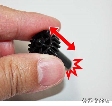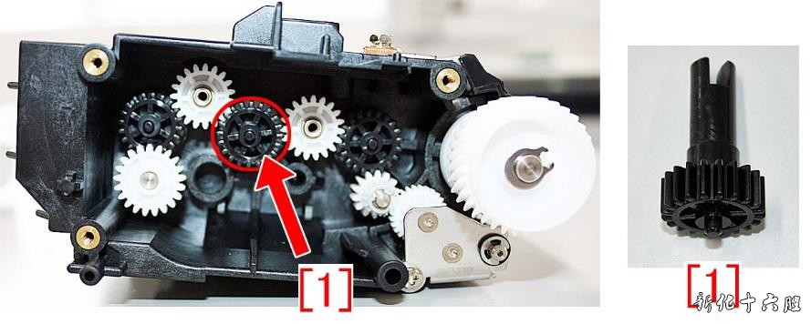 [样张2] 故障原因: 当搅拌板[1]与容器接触时,作用力集中到凸台的底座上,凸台与20T 齿轮[2]连接。重复的作用力可能导致搅拌棒断裂,墨粉不再搅拌或未供应,导致上述现象。如下图所示为20T 齿轮与搅拌杆、普通搅拌杆[3]及破碎搅拌杆[4]的照片。