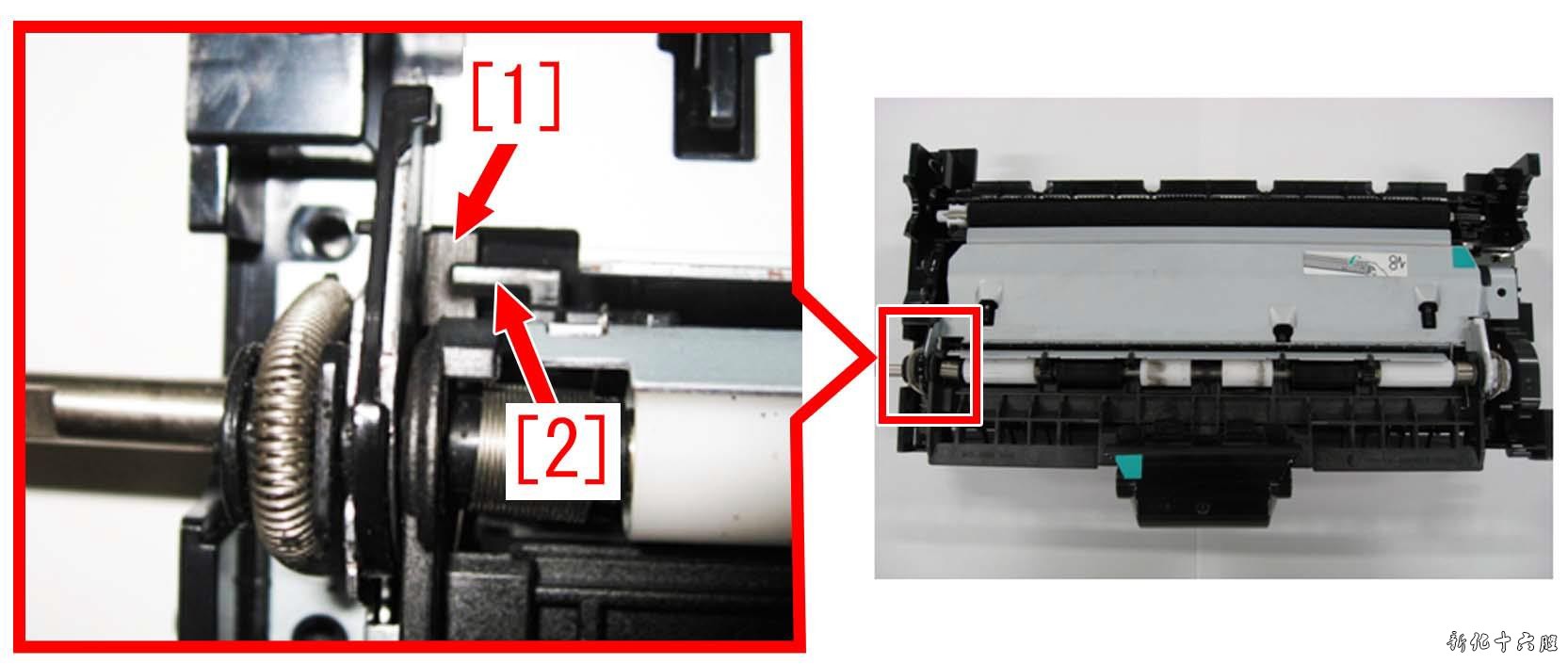[原因] 由于对位阻尼【1】的寿命耐久性的原因,对位部的挡臂部【2】与对位阻尼【1】在接触时由于对位快门开闭会造成一定的延迟。如果开闭动作延迟的话,就会产生纸张到达对位快门时,对位快门未正常打开而造成卡纸的现象。