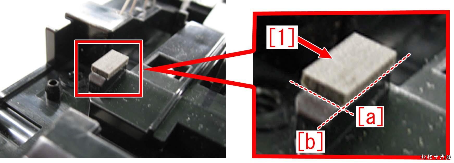 4 ) 将对位阻尼【1】剥除,用镜头纸粘酒精清洁粘贴面。 5 ) 将新的对位阻尼按照基准线【a】和【b】的位置严丝合缝的粘贴。