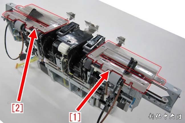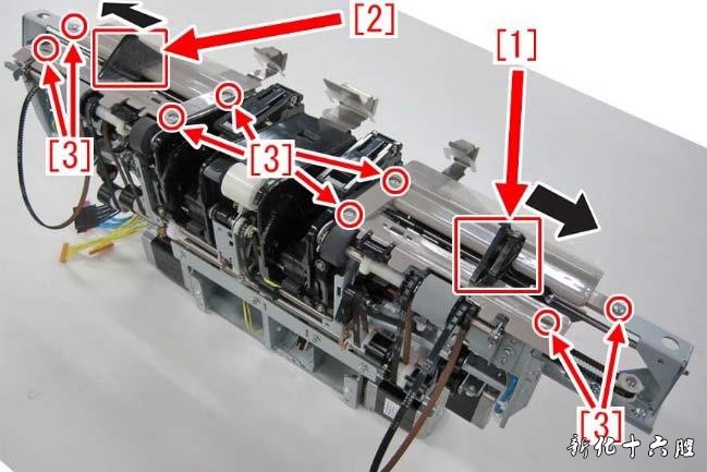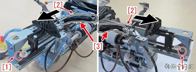 [维修措施] 当出现上述故障时,准备前侧副导轨组件(FM4-4744-000)和后侧副导轨组件(FM4-4746-000), 并按照如下操作步骤进行托盘辅助导轨部件的更换。 1) 按照维修手册内容的指引将处理托盘单元拆下。 2) 将前侧准直板[1]和后侧准直板[2]向箭头方向移动,然后移除螺钉[3](x8 颗)。