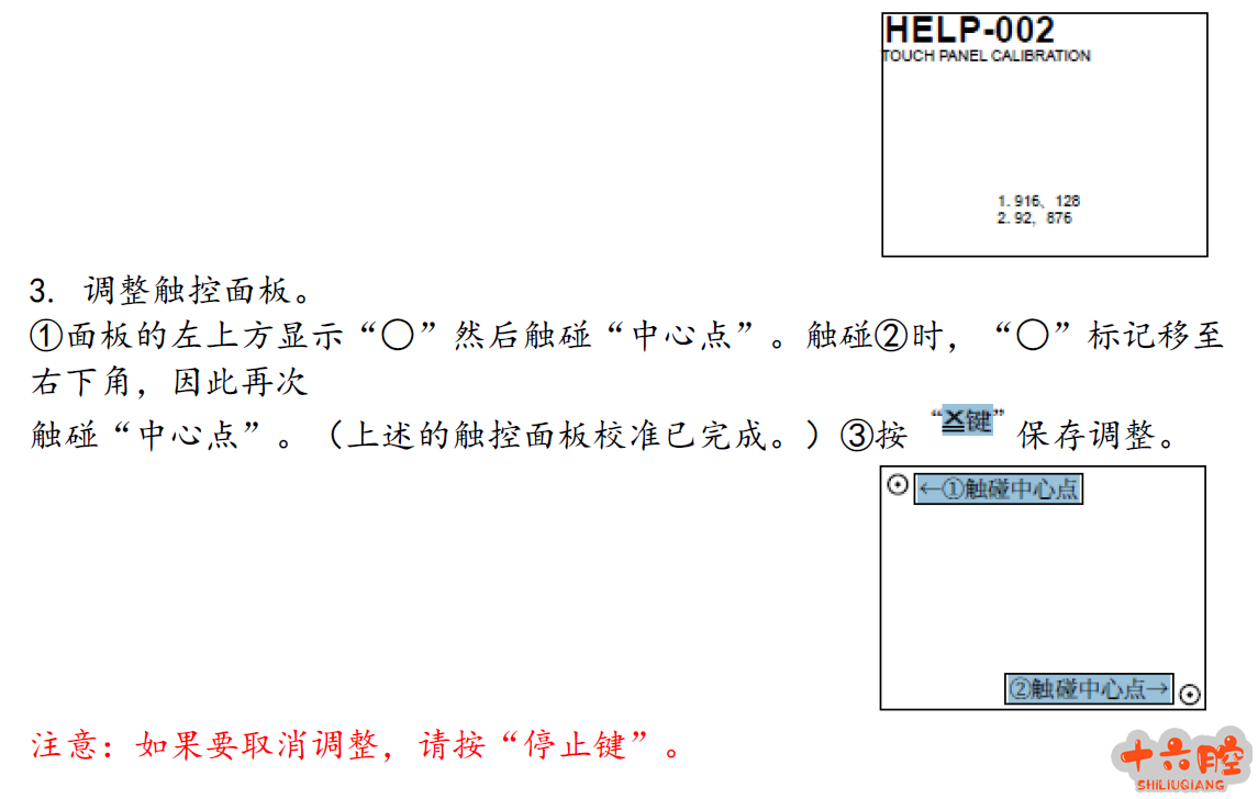 2. 操作步骤 1. 用“数字键”输入“002”,然后按“印刷键”。 2. 选择检查/ 调整触控面板。调整:按“制版键”。请到步骤3,检查:按“主页键”。请到步骤4