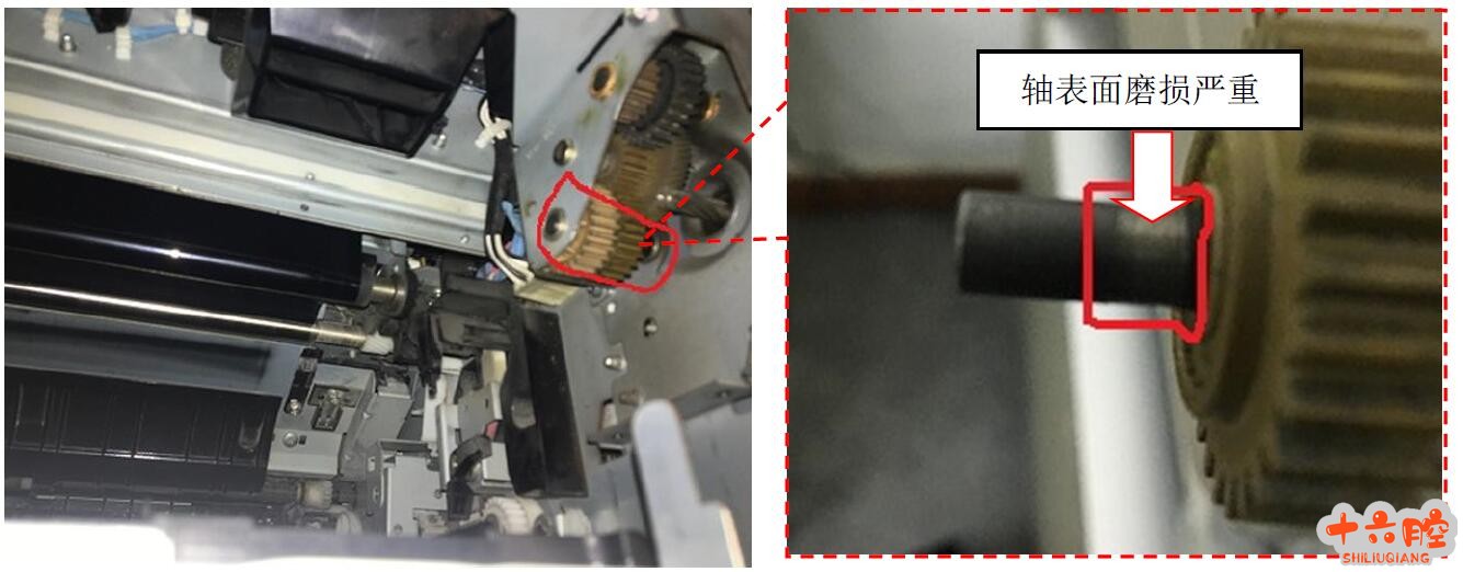 iR-ADV C5030 iR-ADV C5035 iR-ADV C5045 iR-ADV C5051 [故障描述] 提示错误代码E001,维修模式清除代码后可以正常开机,但是打印时会在定影单元部位发生滞留卡纸。 [故障原因] 定影部驱动齿轮组内的单向齿轮固定轴表面磨损严重,导致单向齿轮发生双向转动的情况。