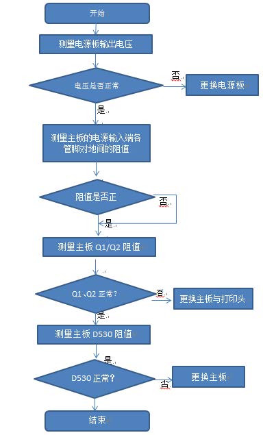 1、故障现象描述: 故障现象:开机后,打印机无任何初始化动作,各指示灯未被点亮或立刻熄灭。 2、故障检测判断流程: 实际维修中发现,L 系列“开机无电”,95%以上均与Q1/Q2/D530 有关。 如果按上述各标准值判断出实测元件阻值或电源输入端阻值异常,可以判定主板有问题。 L 系列机型开机无电故障判断步骤: 1) 检查电源板输出电压,如果电压异常需更换电源板并还需测量主板电源输入端以确认主板状态。 2) 检查主板电源输入端各管脚对地间的阻值是否在标准范围内。 3) 如果通过步骤 2 判断主板异常,可进一步确认主板上元件Q1、Q2(L801 为QM1、QM2)状态,如果Q1 或Q2 损坏则需要同时更换主板与打印头。 4) 如果上步判断 Q1、Q2 正常,还需确认D530 状态,如果D530 异常此时可仅更换主板,打印头一般没有问题。 5) 不同机型的Q1、Q2 在线阻值会有所不同,可以按上述方法对照好板阻值做判断。 6) 如果上述电源板、主板均未发现问题,打印机面板连接线或面板本身也会造成开机无电,可使用好备件做替换检查确认。 测量工具:指针式万用表型号:MF47F 注:使用数字万用表时测量的数值可能与下面给出的标准参考数值不同