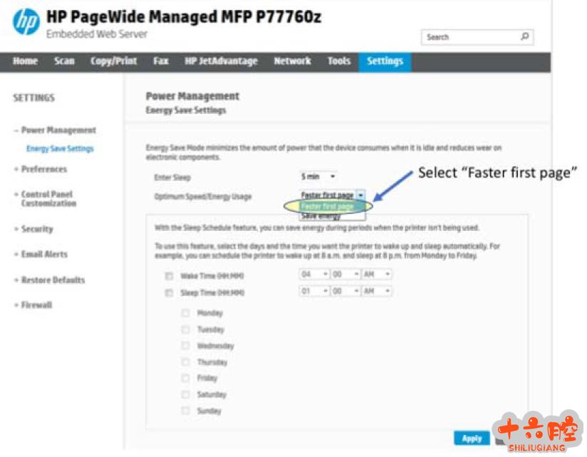 受影响的设备 下表列出的产品在受影响范围内。 单功能机 HP PageWide Pro 750dw HP PageWide Pro 750dn HP PageWide Pro P75050dw HP PageWide Pro P75050dn 多功能机 HP PageWide Pro MFP 772dw HP PageWide Pro MFP 772dn HP PageWide Pro MFP 772zs HP PageWide Pro MFP 777z HP PageWide Pro MFP777zhc HP PageWide Pro MFP P77740z HP PageWide Pro MFP P77740zs HP PageWide Pro MFP P77750z HP PageWide Pro MFP P77750zs HP PageWide Pro MFP P77760z HP PageWide Pro MFP P77760zs 解决方案 当打印机无响应时,拔掉电源线,等待10秒钟,然后插上电源线开机,使打印机进入正常模式就绪。 打印机正常时,使用下面的任何一个选项都可以解决这个问题,一个或者两个选项都可以使用。 选项1:EWS中禁用节能模式 启用“更快首页打印”(Faster First Page)功能,这要求固件版本为1728L。启用这个功能后,打印机就不会再进入节能模式,也就不会再有潜在的机会出现报错。这个选项是最佳的选项,尤其是选项2还没部署的时候。 注意:本选项需要固件版本1728L。 下面的步骤可以在EWS中禁用节能模式 首先需要获取打印机的IP地址,可以在控制面板上找到网络,找到IP地址。 1. 使用连到同一个网络的PC上,或者移动设备上,使用浏览器,输入打印机的IP地址,即可打开EWS。 2. 在EWS页面,点击设置,然后在左侧的导航栏选择电源管理。 3. 点击节能设置。 4. 在优化速度/能源使用(Optimum Speed/Energy Usage)下拉菜单中,选择快速打印首页(Faster First Page),然后点击应用,保存设置。