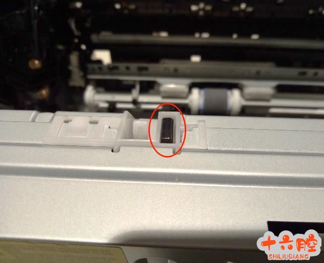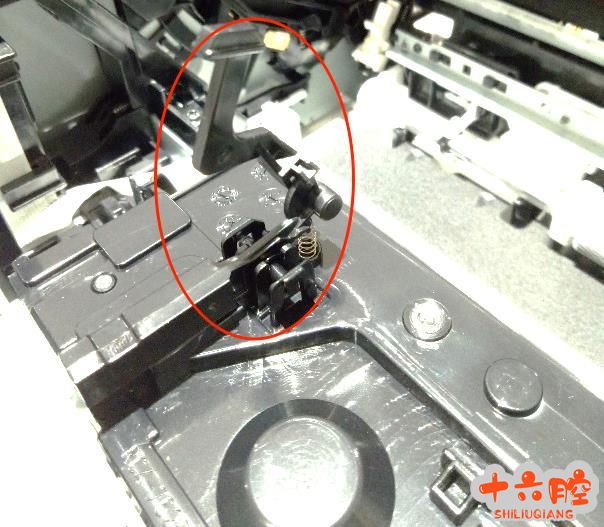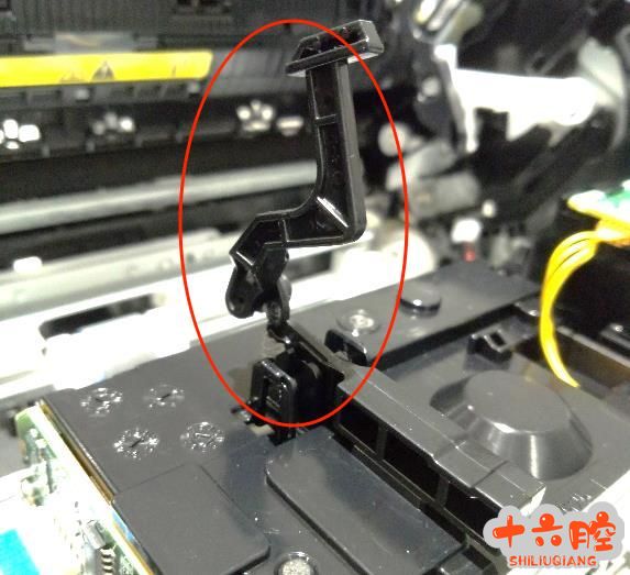 正确的位置,圆圈内正常位置,当关上硒鼓盖后,黑色塑料杆被压下,激光器上的挡片被抬起,否则打印机会提示52错误。