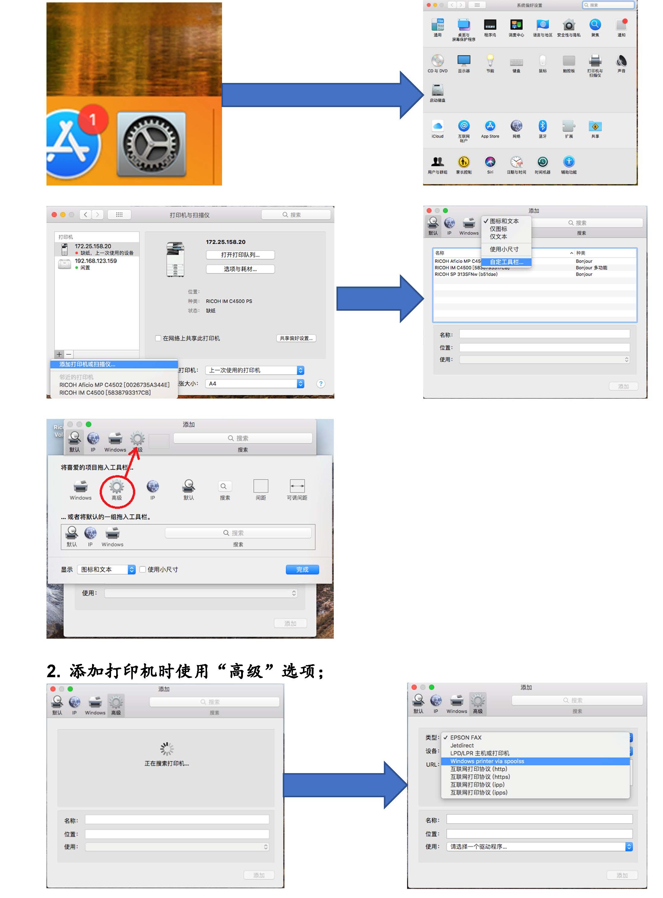 3. 查询到Mac OS共享打印使用的是SMB协议,所以重新添加共享打印机后故障排除。 解决方案 1. 在Mac OS的“打印机与扫描仪”选项中添加“高级”菜单: