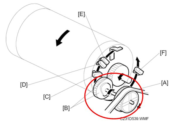 问题:滚筒不能从原位移除。没有错误代码。偶尔发生版纸卡纸。原因1:主电机驱动齿轮顶端螺丝松动(轴上 )措施1: 拧紧顶端螺丝。