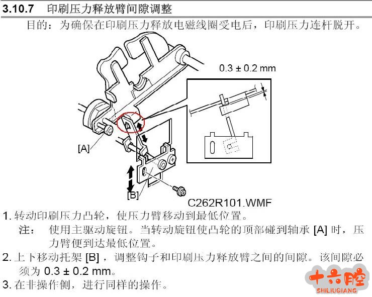症状 HQ9000 印刷时,当前印刷的印品背面会转印到前一张原稿制版印刷的内容。 原因分析 1. 由于印品背面粘上的字迹是之前原稿的内容,所以排除了印品字迹太深而油墨未干,造成印品背面粘上上一张印品油墨的故障情况。 2. 检查下压筒发现表面有油墨字迹,从而判断是由于压筒和滚筒在印刷后接触了,压筒粘上了滚筒版纸上的内容,在下一次制版印刷时转印到印品背面。 3. 检查压筒释放机构发现锁定杆已磨平,每次印刷后压筒锁定时打滑,造成上述故障情况。 解决方案 用锉刀把压筒锁定杆挫出斜面,并重新调整印刷压力释放臂间隙。