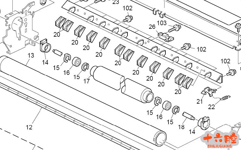 症状 定影出纸歪斜、褶皱(长度小于 1189MM 的纸张较为明显)。 原因 定影压辊一侧轴衬破损,导致定影左右压力不匀,引起纸张歪斜褶皱。 (见下图中 14 号部件,零件编号为B2864148)