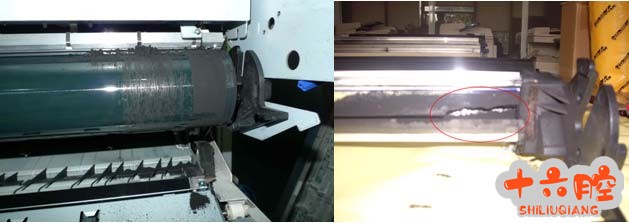 症状 复印品出现黑线条. 原因 OPC 鼓被划伤,清洁刮板一端损坏。(见下图)