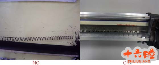 3.拆解卷纸单元的裁刀单元发现该单元导板上有明显的长条小纸屑,初步判断是由于卷纸单元的裁刀单元PM 不良造成废粉堵塞现象的产生。(见下图裁刀单元小纸屑) 解决方案 更换新的 OPC 鼓,清洁刮板,更换新回收搅拌弹簧。 使用不同品牌的纸张会产生程度不一小纸条和纸屑。技术人员需要根据用户的使用情况定期对裁刀单元进行清洁和保养,如果在PM 过程中发现废粉堵塞和回收搅拌弹簧出现缩短的现象,就需要立即清洁回收部分并更换新的搅拌弹簧。
