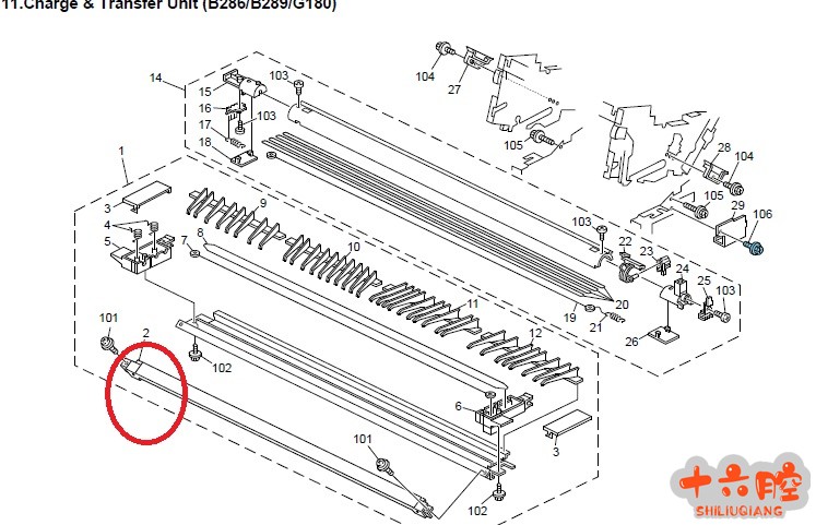 症状: 机器复印件背面纸头有底灰,底灰位置固定,复印件背面中间至尾部没有底灰。 分析出现印件背面出现底灰的原因: 1. 显影组件有飞粉现象。 2. 高压板不良。 3. 机器内部脏。 措施: 1. 仔细清洁机器内部各部件,故障依旧。 2. 更换显影高压板,故障依旧。 3. 检查转印组件时发现转印入口导板过高已经接触鼓的表面,原来技术维修员之前因为过纸问题调整过转印组件的转印入口导板高度,如果入口导板过高接触鼓的表面,鼓转动就会弄脏入口导板,所以才会出现机器复印件背面纸头有底灰。