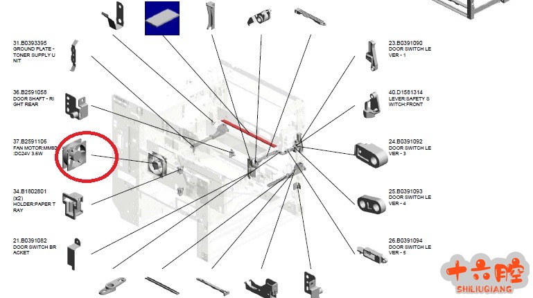 MP2001L_2501L_2001SP_2501SP_1813L_2013L 症状: MP2501SP 面板出现SC530 代码,不能正常复印。 措施:更换定影风扇,试机正常。 故障原因: 许多维修员把靠近定影组件的双面风扇错认为定影排气风扇,导致维修检测错误。 正确定影排气风扇位置如下所示: