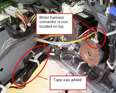 症状发生进纸卡纸,但机器内没有卡纸纸张。 原因:对位电机周围的线束盖板受损,触发短路。 解决方法生产线 • 对位电机已安装,电机线束开关在顶部(目前位置的180度)。 • 线束有绑带进一步保护线束。