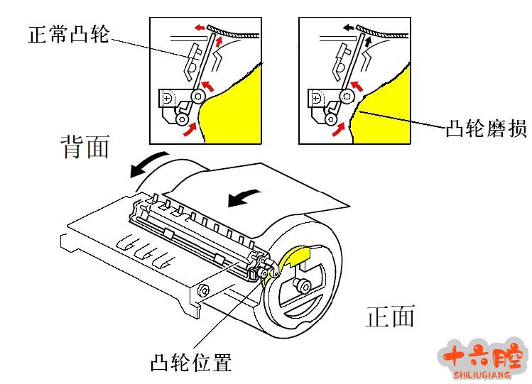 原因 压筒纸夹控制凸轮表面磨损,造成纸夹打开不完全,纸张推移动作不到位。
