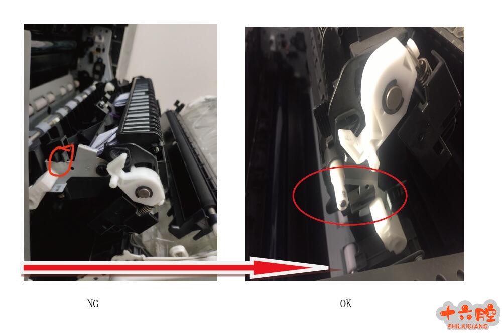 3:. 更换转印辊组件,故障依旧。 4: 仔细检查转印部分,发现转印辊前侧支臂部分断裂,不能未卡在正确的位置,造成转印辊工作时一侧无法接触到鼓,导致该故障现象(见下图)