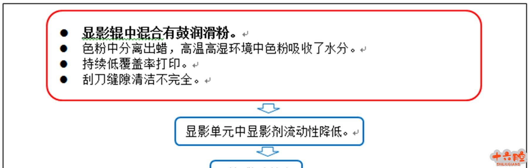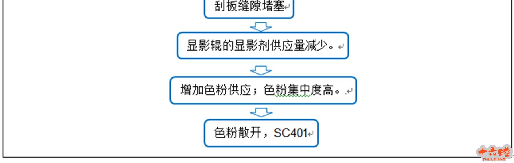 症状 单元中可观察到散开的色粉。 原因 问题情况见下表。红框所示主要是4 个原因。