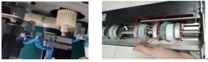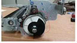 5. 检查对位搓纸皮带的磨损情况,若机器印量较大,考虑橡胶老化,可以将橡胶 圈拿下来转动一个角度,再重新安装。如上图: 以上步骤检查完毕 J031 基本上可以解决了。