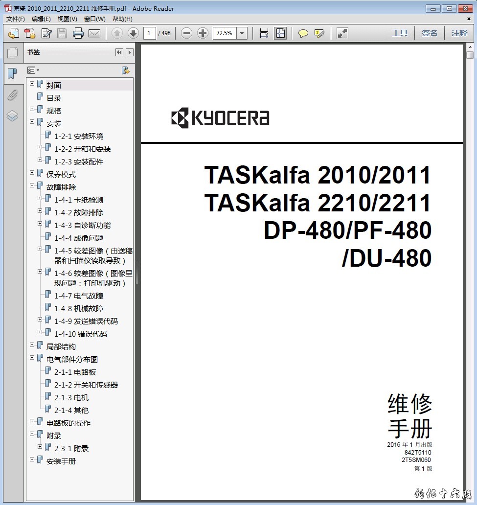 京瓷 TASKalfa 2010 2011 2210 2211 复印机中文维修手册 资料语 言:中文格 式:PDF电子版,无加密页 数:498页手册内容详实,图文并茂,是维修人员的好帮手,有了维修手册,这款机子的拆卸、故障排除您就不用再发愁了!即使是普通的用户,也可以根据维修手册解决简单的故障