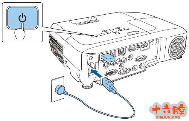 1.3.按住“电源”开关按键的同时将电源线插入投影机电源插孔,当所有指示灯亮起时,松开“电源”按键