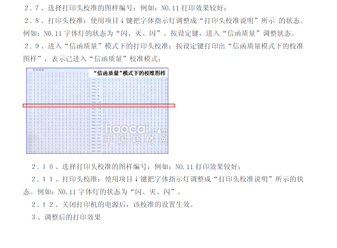 2.4、选择校准图样的编号:从“草体模式下的校准图样”中,根据打印效果找到竖线最直的图型。例如:可看出NO.14 打印效果较好; 2.5、打印头校准:使用项目↓键把字体指示灯调整成“打印头校准说明”所示的状态。 例如:按NO.14 图样进行校准,使用项目↓键把字体指示灯调整“亮、闪、灭”状态。 打印头校准说明
