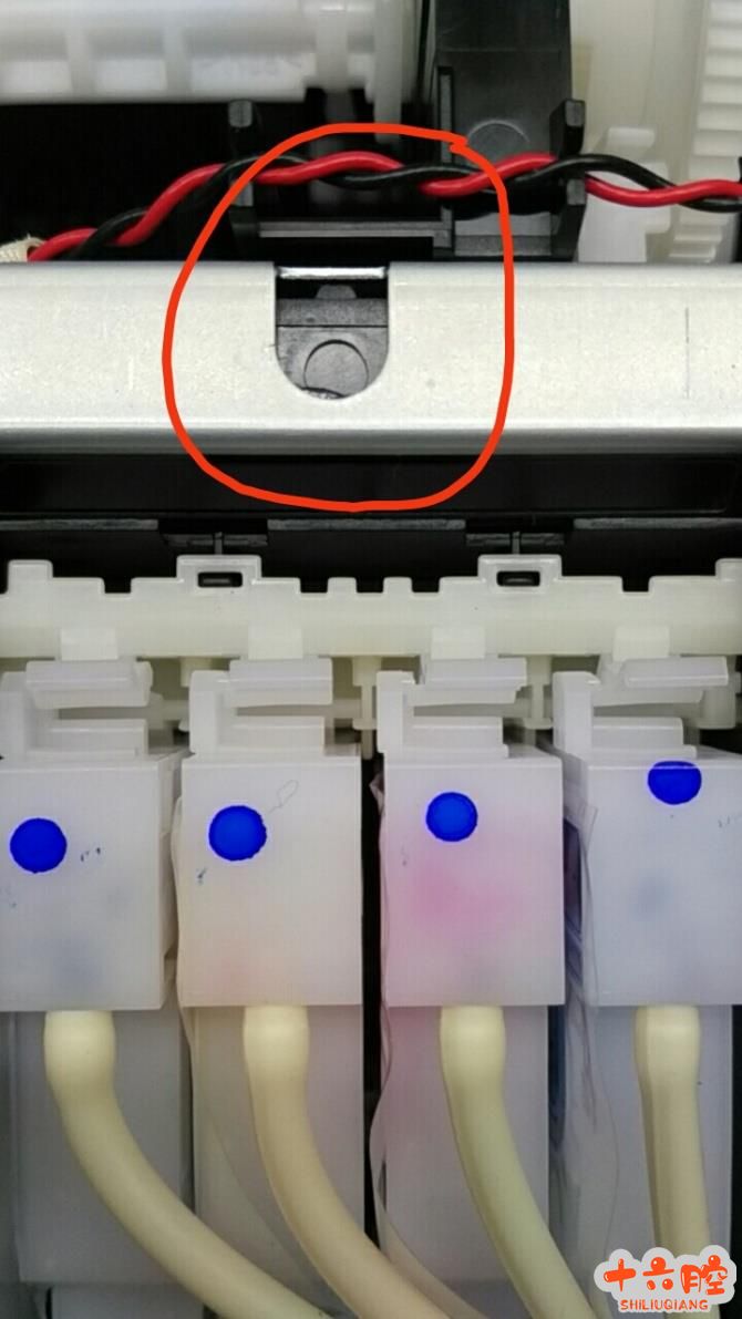 4. 故障原因经过仔细观察,字车这个凸起是字车在清洗位置时顶住字车,使打印头和CAP 组件密封。当这个凸起磨损,字车间隙变大,打印头和CAP组件密封变差,清洗打印头时出现漏气,导致堵头。 5. 维修方法更换字车 6. 补充说明可以通过机架上一个孔来观察字车磨损状况