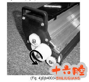 预防: 磁辊转动的阻力过大,可能是引起离合吸力不够的原因,为了尽量降低显影传动的阻力,请检查如下地方: 1. 显影仓内墨粉不要过多,在机器提示添加墨粉时,再添加一支墨粉; 2. 装机时,也只添加一支墨粉; 3. 如下图,手动转动显影传动齿轮,确保齿轮转动顺畅。如遇到转动力量过大,则需要清洁并重装磁辊刮片,安装步骤请看维修手册第四章 4.2.2。