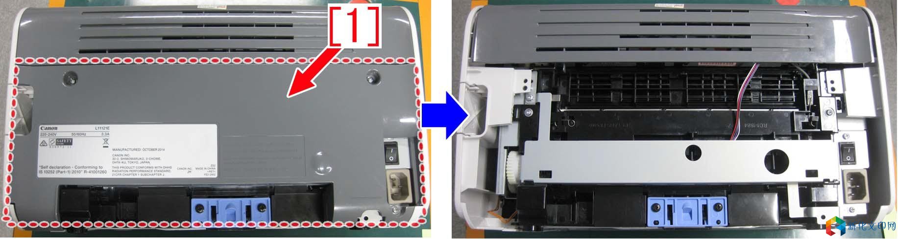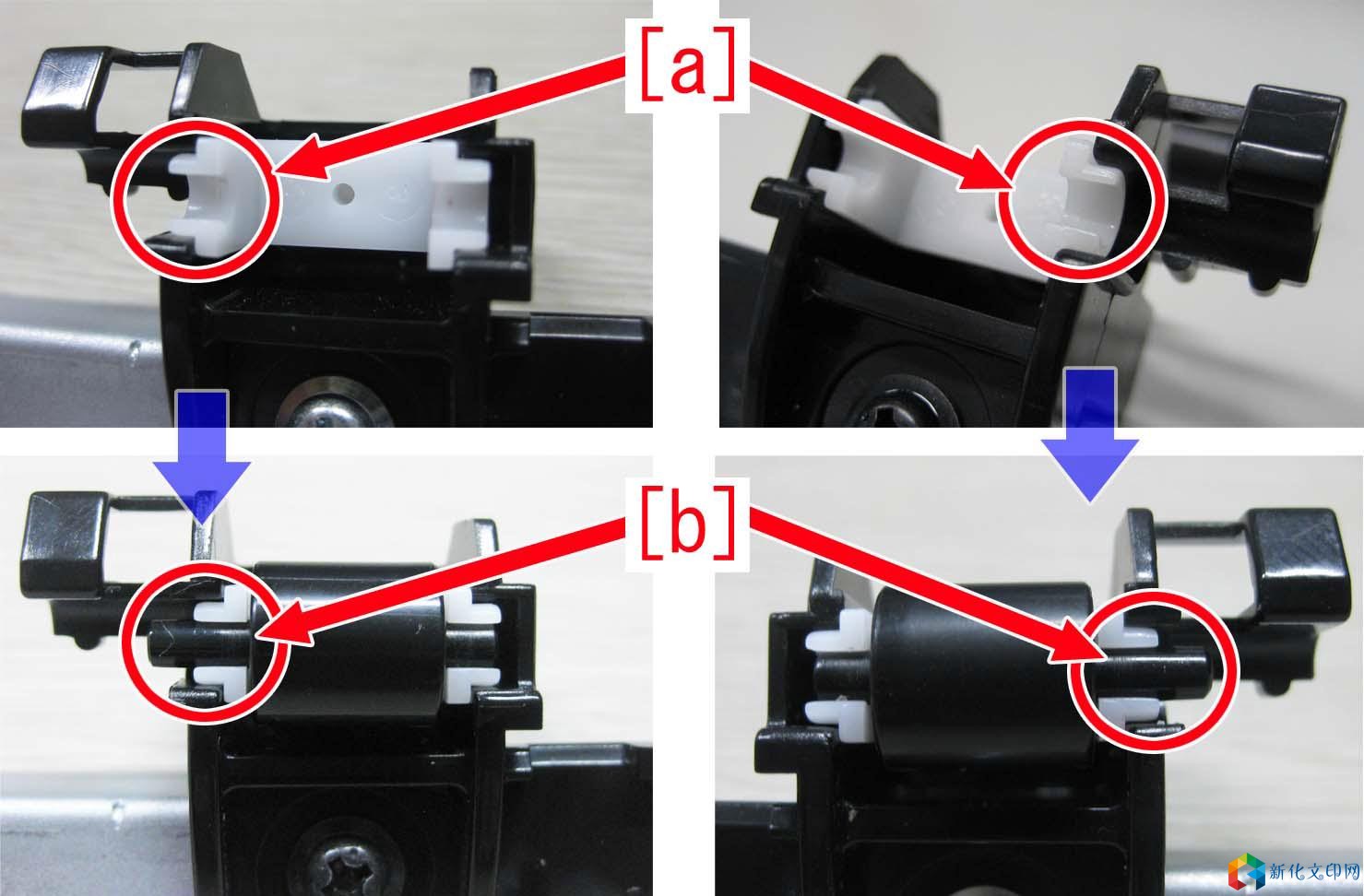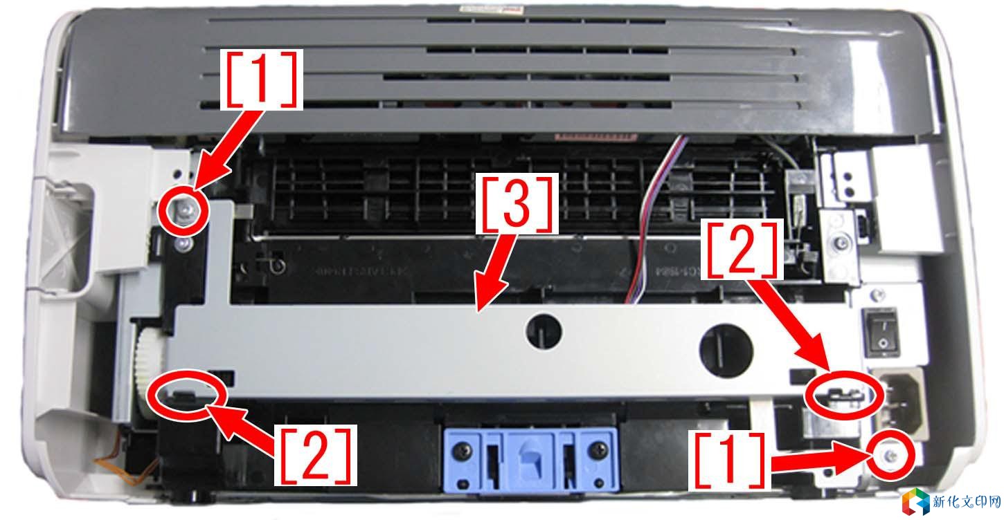 产品 型号: 型号: LBP2900 LBP2900+ LBP3000 【故障现象】 在打印过程中搓纸过程会发现异常的声音。 【故障原因】 输送横杆组件的轮子两侧的固定杆因磨损老化,与轴套摩擦时发出异常的声音。 【维修工作】 当异响问题发生时,请准备两个新的输送横杆组件的轮子(RC1-2059-000),此零件材质已经进行改进,更加耐磨,并且已设立为标准的零件。 将旧的输送横杆组件的轮子更换为新的轮子的操作步骤,请参考下面的内容。 1、 将机器翻过来,后部朝上。取下两颗螺丝[1]。