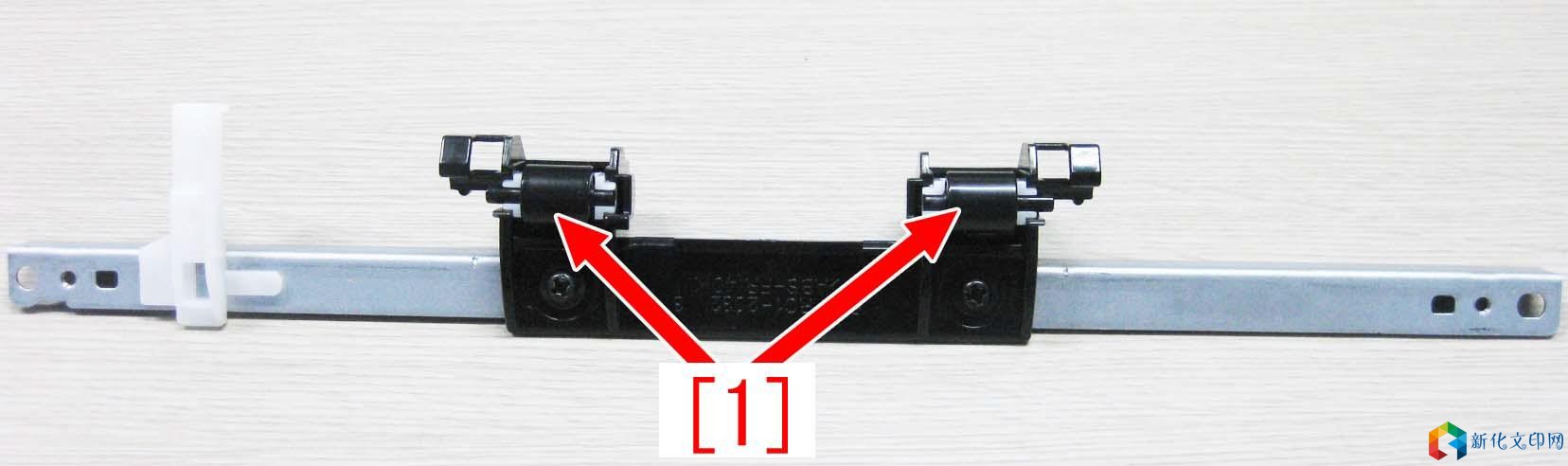 6、 取下输送横杆组件上的两颗螺丝[1],当取右侧的螺丝[1]时,请注意不要损坏纸张宽度传感器[2]