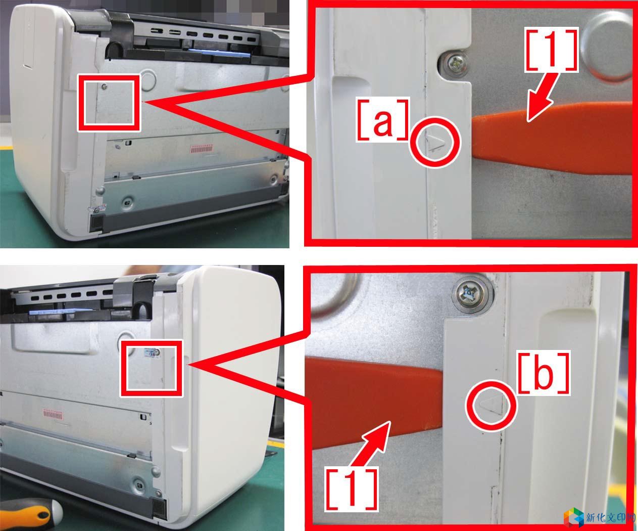 2、 在左右两侧的三角标记[a] 处插入工具[1],释放卡扣。