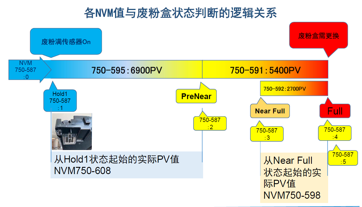 二,原理介绍: 与其它几款EDS彩机的废粉盒不同,Beni/Botan/Botan2机型的废粉盒满传感器,被设计在废粉盒尾端的底部,当废粉随着搅拌杆被排送到此传感器区域时,废粉满传感器被触发,但此时废粉盒尾端中上部仍有少量的空间可以承载更多的废粉。因此,机器在接受到废粉满传感器被触发的信号后,并不会马上提示废粉盒满信息,而会开始根据印量(PV)和ICDC(打印覆盖率)两个参数,对后续副本输出进行计数,在达到预设值后才发出废粉盒满信息,提醒客户预备和更换废粉盒。
