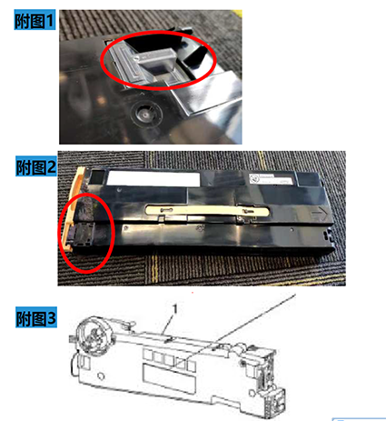 ApeosPort/DocuCentre-VII C7773/6673/5573/4473/C3372/C2273 概述: 对Botan/Botan2/Beni机型废粉盒状态的逻辑判断介绍,并提供相关故障的解决方案 内容: 最近场地上发生了几起机器内部废粉盒里废粉已堆满,但UI没有提示信息,废粉盒未被及时更换,导致废粉堵塞甚至将感光鼓磨损的故障。为此,本公告将对此系列机型废粉盒满的判断原理进行介绍,并提供相关故障的解决方案。 一,如何判断堵粉故障是由于废粉盒满未提示导致的: 1,参考BSD9.22,在工程师模式下进入部件控制,确认091-201(TONER BOTTLE FULL SENSOR)的状态是否为H。 2,取出废粉盒,观察废粉盒尾端底部的塑料透明窗口内是否已经堆积碳粉。(参考附图1) 3,废粉是否已在废粉盒入口处堆积(附图2),且机器前侧的废粉通道组件(附图3))也有废粉堆积的状况或趋势。 若确认机器有以上三种状况,则可判断为机器排废粉量异常,废粉盒未及时提醒更换导致的堵粉故障。