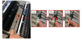 3、按照上图的方向,把垫环扣到轴上,扣在肋状板的中间; 4、按图示旋转180° 5、按图示滑动垫环,使它能够稳固的卡在L/H Cover和双面辊2之间 6、关上L/H Cover