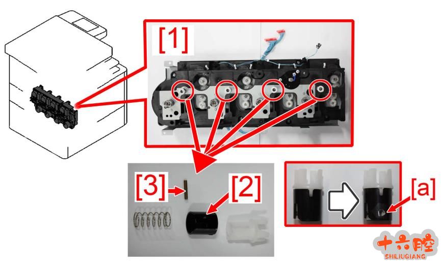 iR-ADV C5535 iR-ADV C5540 iR-ADV C5550 iR-ADV C5560 iR_ADV C5235 iR_ADV C5240 iR_ADV C5250 iR_ADV C5255 iR_ADV C5030 iR_ADV C5035 iR_ADV C5045 iR_ADV C5051 由于耦合限位器破损导致出现错误代码E027-0x00 和E021-0x00 的对策措施。 [故障现象] 提示错误代码E027-0x00 和E021-0x00 - E027-0x00 : 显影组件出现供给错误(x=1:Y, 2:M , 3:C , 4:Bk) - E021-0x00 : 显影马达错误(x=1:Y, 2:M , 3:C , 4:Bk) [故障原因] 在设备已经使用了一段时间以后,由于平行销[3]的反复摩擦导致主驱动单元[1]上的耦合限位器[2]表面出现孔洞[a]。在这种情况下,如果平行销[3]穿过孔洞发生脱落就会导致主驱动单元[1]运转失败并且出现上述错误代码。