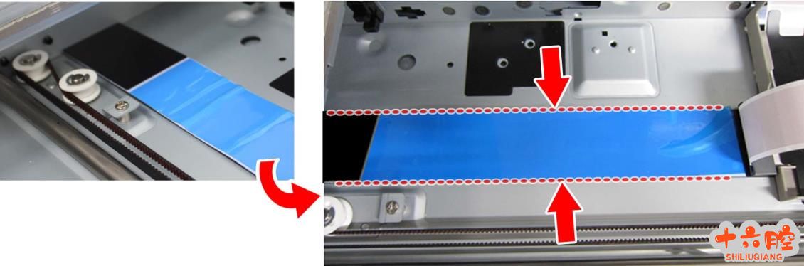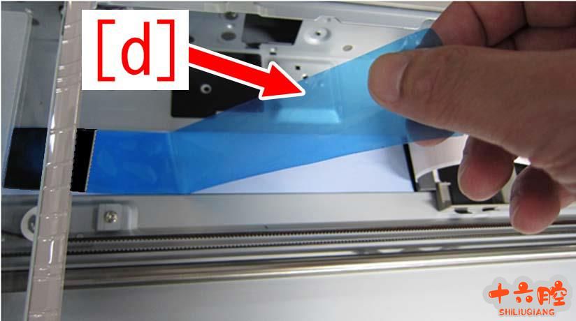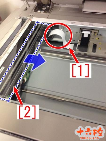如下照片显示的是扁平线缆[1]发生凸起时的状态。[2]指示的是扫描单元,蓝色箭头所指示的是扫描单元移动的方向。