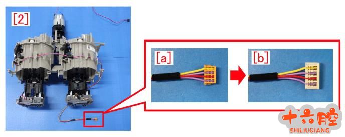 [参考] 按序列号进行判断,与[出厂时以对应序列号]相同或更晚的墨粉瓶组件的变化如下。 - 线束的连接部分由[a]型改为型。 [1] 墨粉瓶驱动组件(Y,M)。 为了方便起见,将墨粉瓶驱动组件(Y, M)[1]的线束从下图的挂钩上取下。