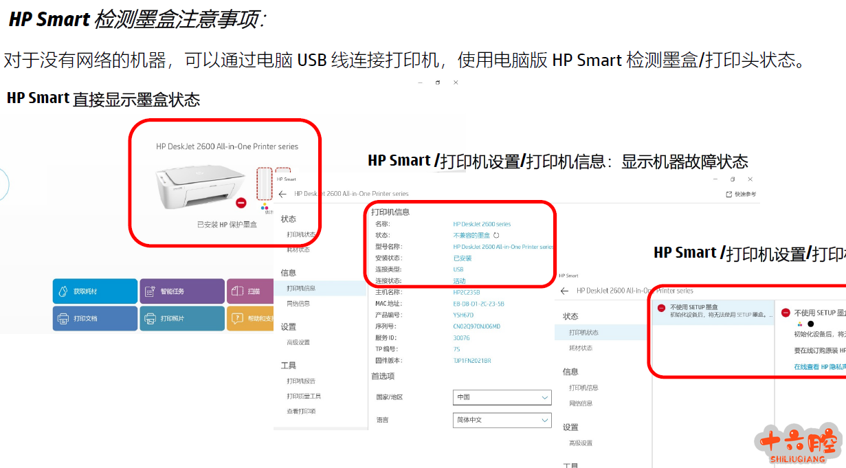 惠普没有触摸屏机器的墨盒故障 以HP DeskJet 2622为列 通过HP Smart检测墨盒故障 1、对于没有触摸屏的打印机,从面板上只能看到墨盒不可用,但不能确认具体故障原因 2、通过电脑驱动(打印机助手)检查打印机状态;在墨盒有故障时,可能无法检测出墨盒状态 3、通过HP Smart检测方便快捷,不需要安装打印机驱动程序 4、打印机开启无线直连功能 5、获取无线直连密码 6、手机连接打印机无线直连网络,或是打印机的初始网络(Setup网络) 7、HP Smart添加无线直连打印机 8、通过HP Smart检测墨盒(打印头)状态 HP Smart 检测墨盒注意事项: 对于没有网络的机器,可以通过电脑USB 线连接打印机,使用电脑版HP Smart 检测墨盒/打印头状态。 2个墨盒都安装好,再检查墨盒状态。只安装1个墨盒,可能造成识别状态不准确。 单墨盒使用:使用过程中会提示墨盒问题。安装2个墨盒完成打印头校准后,再使用单墨盒打印。 打印TAP10报告页: 打印方法:参见FTP上资料(HP喷墨打印机组合按键列表) OfficeJet机型可以打印状态报告,检查:HP,使用(Use)和SS 等字段的数值: 也可以通过“打印和扫描卫士/ 打印机/ 耗材级别”菜单项检查“USE 和HP ”等字段的数值:
