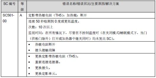 症状: :ProC5300S 在打印过程中出现代码 SC561-00。 1、使用纸张尺寸:70 克 A4 双胶纸。总印量 300 万 A4。 2、打印过程中出现卡纸,取出后推入抽屉报代码。开机自检 3 分钟后也会报错。 3、检查 SP7403,只有 SC561-00 代码 原因: 1、询问:首先和操作员沟通设备情况,判断是否人为因素造成故障,仔细分析。 2、维修手册:代码指向定影带热敏电阻(TH5) 维修方向热敏电阻传感器,线束,机器和定影对插头,IH Inverter 3、SP 代码测试:SP1106-002 检查定影热敏电阻(TH5)真实温度。 4、电路检查:万用表测量传感器,定影插头到传感器,机座插座到 IH 板。 5、硬件检查:定影旋转是否正常,排除因为定影轴承损坏,造成旋转不良。 6、制定维修方案后逐一维修检查 解决方案: 1、对应手册查看 SC561-00 代码的解释。
