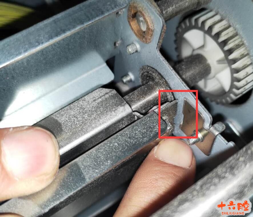 1.复印机打印文件偶尔有折角现象,都是外折角。检查纸路看是否异物掉在纸路上,导致走纸不顺畅,检查未发现有什么异物。 2.再次排查纸路每一个环节,是否纸路导板变形,以及有断裂现象。 3.最后发现图下图处纸路导板断裂,取出导板重新用AB胶粘几层,安装固定导板,测试了几千张,未见故障现象,彻底解决折角问题。