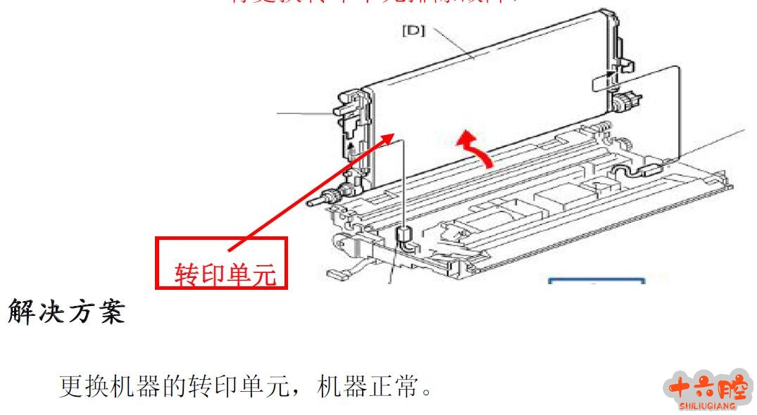 原因 机器的鼓单元不良。 机器的主充电不良。 机器的显影单元不良。 机器的转印单元不良。 维修过程 现场维修措施: 1)进行机器鼓单元,显影单元,转印单元和主充电拆装和清洁。启动机器故障无法排除。 2)更换机器的鼓单元,显影单元和主充电,故障依旧存在。 3)更换机器的转印单元。故障排除。(注:检查转印带没有磨损现象,只有更换转印单元排除故障)