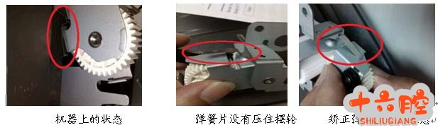 原因: 1)主板不良; 2)定影单元电磁铁不良; 3)定影驱动齿轮弹簧片不良。 维修过程: 现场维修措施: 1)更换机器主板,故障依旧; 2) 检查定影单元,发现每次卡纸时,定影热辊不转动,更换定影电磁铁,故障依旧; 3)检查定影驱动齿轮,发现齿轮上的弹簧片位置不良,校正弹簧片的位置后,弹簧压住摆轮,能够给摆轮一个向外的压力,让摆轮与定影齿轮咬合,试机正常。 如图中红圈所示: