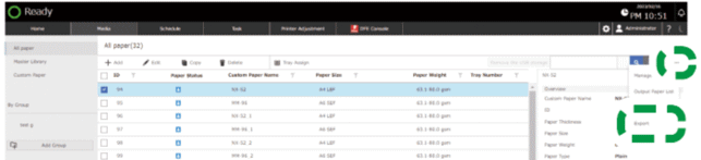 <附录:将除信封之外的所有介质的压印尺寸更改为 1 的步骤>将 USB 存储器插入机器控制面板上的 USB 主机接口。 按下[媒体]中心。 选中要导出的纸张设置的所有复选框。要选择列表中的所有论文,请选中列标题中的复选框。 按 [...],然后按[导出]。